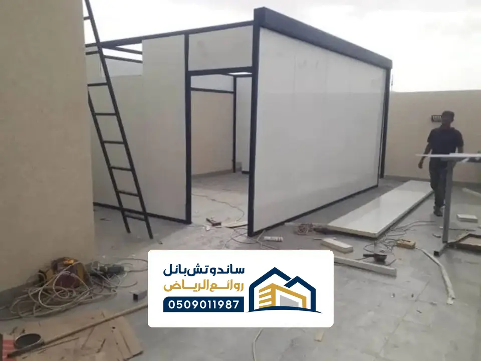 - تركيب ألواح الساندوتش بانل عبر تركيب الجدران أولًا، ثم السقف، مع التأكد من الربط والمسامير والختم.